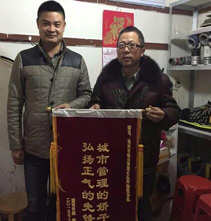 1月16日下午3点左右,芦淞市场临街门店酷炫e族老板朱亚平来到芦淞市场群综合治理大队二中队便民服务岗送来锦旗,以示对市场管理局感谢。朱老板激动地说,往年的这个时候,人民南路步行街上到处是随意占道摆摊,别说货物出入就是人过个身都不方便。而自去年6月份芦淞市场群综合治理大队接管以来,整个芦淞市场群的市容状况发生了很大的改变,很少看到占道摆摊的,偶尔出现几个占道摆摊也都被队员及时劝离。作为我们老百姓,对市场管理局积极作为表示万分感谢。