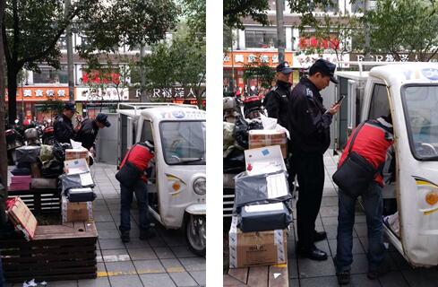 在网络发达的今天,快递作为物流行业,为我国电子商务经济做出了贡献。但快递人员占用人行道收发快递方便了人民群众的同时,也阻碍行人通行,更影响了市容市貌。近日,芦淞区城管大队三中队队员针对辖区内快递人员违规占用人行道堆放货品投诉较多的地段进行巡查,对快递车辆货物违规占道的行为及时清理,并现场劝导教育快递人员,提高其维护市容市貌的意识。