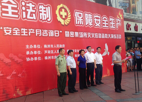 2015年株洲市“安全生产月”宣传咨询日暨密集场所灭火应急疏散大型演练活动于6月16日上午9:00在芦淞市场群中国城市场开展,此次活动市领导杨玉芳、杨宋虎、余明刚参加,消防、交警、急救中心等多部门联合参与演练。