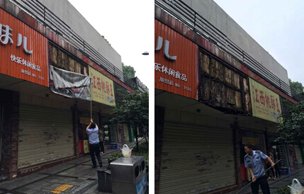 5月28日上午,芦淞城管大队执法队员在人民南路富豪街巡逻时,发现沿线一门店的广告牌破损严重,有一半已经脱落悬挂在门头,严重影响视觉美观。由于没有楼梯等专业工具,加之广告牌破损严重且所处位置较高,执法队员立即找来长木棍钩子等工具对破损广告牌进行清除。