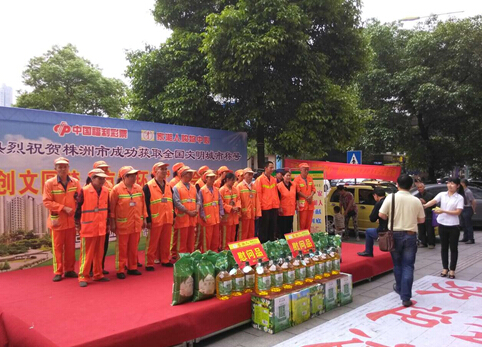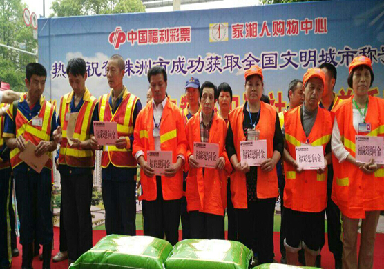 为了表示对我市创建文明城市做出贡献环卫工人的感谢,2015年5月16、17日,株洲市福彩中心、家乡人购物中心为我区部分环卫工人送上了精心准备的礼品。