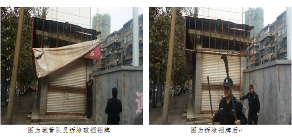 城管队员通过调查联系,未找到业主当事人,无法责令当事人进行整改,但为确保过往行人的安全,避免招牌脱落造成危害,城管队员当即找来工具,将破损的招牌拆除,及时消除了安全隐患,维护了市容环境。
