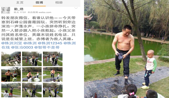 “转发朋友微信,看谁认识他--今天带崽到石峰公园蔷薇园玩,突然听到旁边深池一声落水声,一小孩拼命挣扎。突然一人箭步跳入把小孩救起。小孩父亲问其姓名单位,英雄未说姓名电话,只说是在城管上班……”10月12日,这条新浪微博被疯狂转载,消息迅速传播开来。