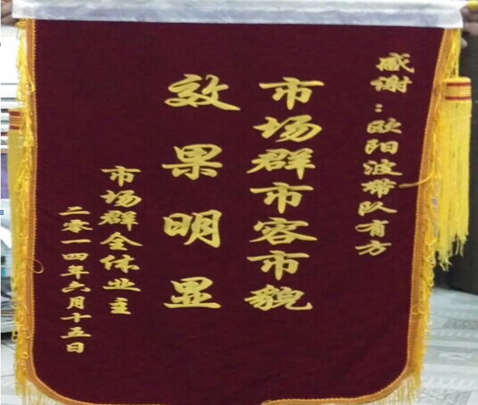 6月15日,芦淞服饰市场群业主代表拿着一面锦旗来到芦淞城管大队岗亭,将这面写有“市场群市容市貌 效果明显”的锦旗送到市场群片区负责人欧阳波手里,感谢芦淞城管为改善市场群面貌所付出的努力。