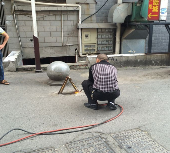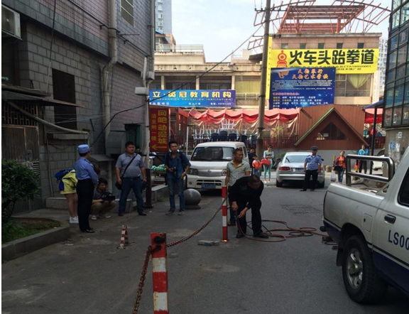 近日,芦淞城管大队接到市民举报,反映他家附近的马路上突然多了几个地桩,还用锁链围成一个停车位,占去了半条街。城管执法队员赶到现场查看后表示,这种非法占用了消防通道,私自设置停车位的做法,违反了《中华人民共和国道路交通安全法》相关规定,存在很大安全隐患,必须马上处理。由于安装的是铁质地桩,城管执法队员请来专业人员用氧气焊,将地桩切除。
