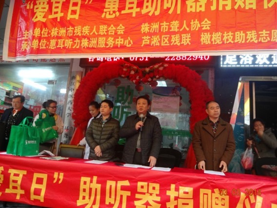 3月3日是全国第十五爱耳日。株洲市残联、株洲聋人协会主办,惠耳助听器株洲服务中心、芦淞区残联、株洲市芦淞区橄榄枝志愿者协会承办的“爱耳护耳,聆听爱的声音”捐赠助听器活动,在芦淞区供霄大厦一楼隆重举行。免费为患有听力障碍的市民进行听力检查。并为部分符合条件的残疾人,提供定制式数字助听器及耳背机共10台。
