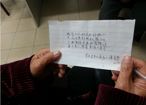 在敬老院里,英武飒爽的城管执法者变成了体贴孝顺的后生晚辈,队员们不怕苦、不怕脏。男队员挖坑植树、清理白色垃圾,干劲十足;女队员发扬她们细心、体贴的优势,为老人家打扫卫生、拉家常。其中一位90岁高龄的奶奶为城管队员的到来,现场做了一首诗,整个活动现场暖意融融,情真意切,气氛十分活跃感人。城管队员用亲子般的真诚和温暖为老人们送去了一片爱心,老人们在欢歌笑语中度过了难忘的一天。