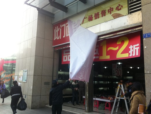 北片区市场群中队在巡查中,对车站路金轮时代广场一临街门店乱设广告招牌的市容违章行为进行了查处,并当场予以拆除。