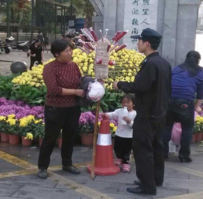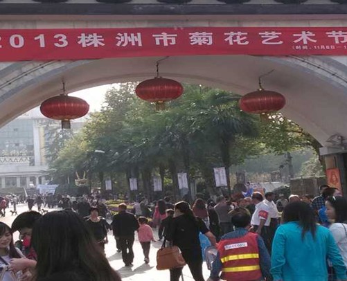 11月8日上午,2013株洲市菊花艺术节在神农公园开幕,上万盆色彩绚丽的菊花争先绽放,前来观赏菊花的市民络绎不绝。一些不法摊贩抓住这个“商机”在神农公园门口做起了生意,严重影响了市容环境。在菊花艺术节期间,为了给市民提供良好的赏花氛围,芦淞城管大队专门安排队员负责神农公园周边的市容市貌,对流动摊贩和市民的不文明行为进行劝导。