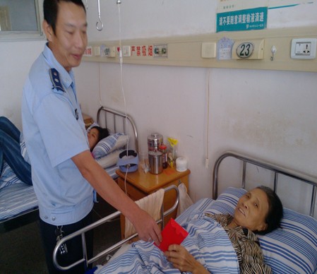 监督员和队员们看到眼里,心生同情,于是大家主动为其捐款献爱心,并将2000元爱心捐款当场交到朱霞辉手中,大家还鼓励她一定要挺过难关。