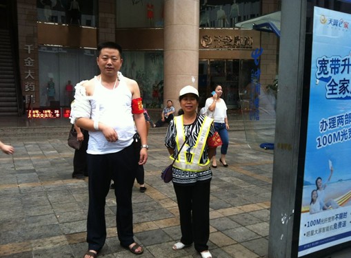 近日,在株洲的街头有这样一位特殊的城管志愿者,他身穿白色背心,左手手臂上戴着“城管志愿者”红袖章,右手手臂上缠着纱布绷带。这位特殊装扮的男子吸引了很多过往市民的目光,他就是芦淞城管大队五中队中队长唐继征。由于株洲市目前创文形势非常严峻,唐队长带伤仍然坚持工作。他说虽然现在自己不能穿上制服去执法,但也要作为一名城管志愿者为株洲市的创文贡献一点力量。芦淞城管队员用自己的实际行动为株洲的文明建设添砖加瓦,相信大家今天的付出一定能换来株洲美好的明天。