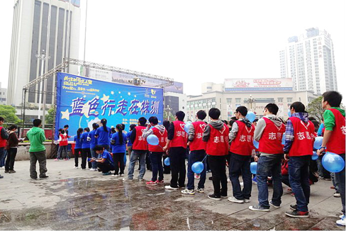 志愿者们分两路,手举“不排斥,不歧视”的蓝色宣传牌,沿着中心广场,经过建设路,电信大楼,滨江路和王府井,火车站,一医院滨江路再经株洲大桥汇合至滨江广场。向市民派发宣传资料,介绍自闭症相关知识,呼吁给“星星们”更多的包容和爱。在这次行走队伍中有位志愿者家长带着孩子一起宣传自闭症知识。