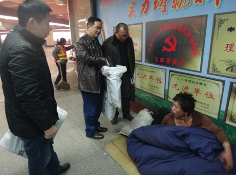 1月7日晚,芦淞区民政局局长刘中南、建设办事处副主任杨志农一行来到市中心地下通道为流浪乞讨者送去御寒物资。