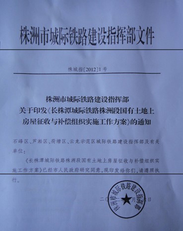 10月18日,城际铁路株洲段项目建设工作部署会在市政府召开,这标志着城际铁路国有部分房屋征收和补偿工作正式拉开帷幕。芦淞区城际铁路国有部分房屋征收涉及到11家单位,住户213户,拆迁总面积25915.25㎡,预计在2013年7月份全面完成国有房屋征收。目前,区征拆总指挥部办公室正牵头做项目征收测算等前期准备工作。
