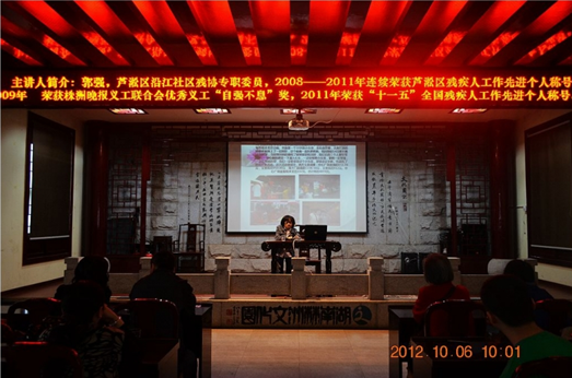 10月6日,芦淞区残疾人“快乐鸟”郭强登上了市图书馆的“神农大讲坛”,她以《折翅也飞翔——快乐鸟心灵驿站》为题,讲述自己身处逆境、不折不挠的奋斗历程,为长假里的市民提供了一场励志讲座。
