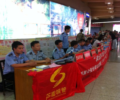 5月12日上午,芦淞区城管大队参加了由区应急办在中心广场地下厅组织的应急知识宣传活动,向过往市民宣传安全应急知识,发放《温馨告知书》、《株洲市城市容貌规定》等宣传资料60余份,接受咨询20余人次。
