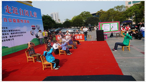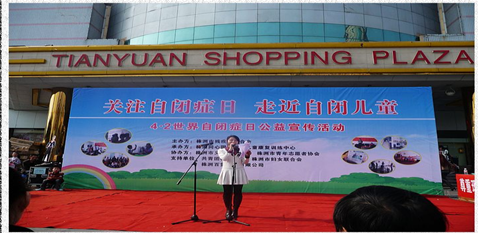 2012年4月2日是第5个“世界自闭症日”。为了让社会大众更加了解自闭症及自闭症群体的生存困境,也让自闭症群体及其家庭感受到了更多关心和支持。当日上午9点,一场主题为“关注自闭症日,走近自闭儿童”的大型公益宣传活动在长江广场天元超市门口开始了。
