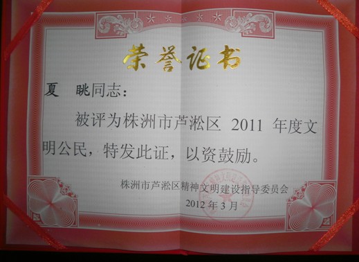 3月9日上午,在芦淞区“2011年度精神文明创建工作先进表彰大会”上,芦淞区城市管理行政执法大队建宁中队中队长夏眺同志因其自觉遵守和实践公民基本道德规范,以自己实际行动展现文明行为,而荣获“芦淞区文明公民”这一光荣称号。