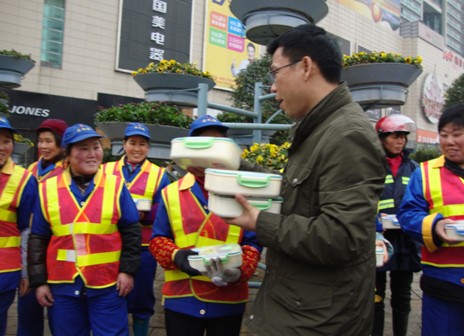 环卫工人大多数为贫困的外来务工人员,家人不在身边,且工作地点在一线马路,中午就餐极为不便。随着3月“雷锋月”的到来,为进一步弘扬雷锋服务人民、助人为乐的奉献精神,结合实际情况,3月8日,芦淞区环卫处经株洲广播电台牵线搭桥,联系海联爱心车队对工作在中心广场一带的环卫工人进行慰问,统一发放爱心盒饭。