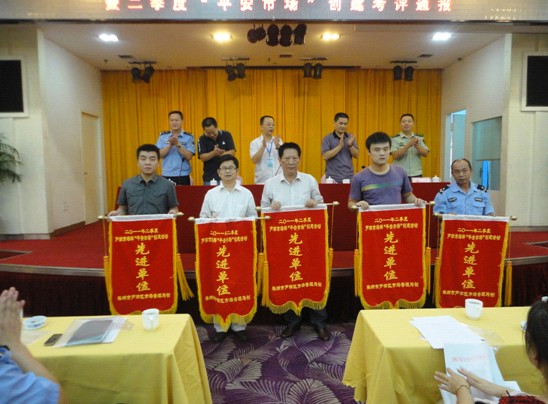 会上首先通报了“平安市场”创建工作考评情况,金三角市场、大地市场、环洲城市场、株洲皮具城、银谷市场分别以85.9分、85.7分、85.5分、85分、84.8分位居考评结果前五名,并被授予“二季度‘平安市场’创建活动先进单位”光荣称号;淞华内衣城75.7分、淞北安发大市场75分、智超广场74.8分、金帝市场73.2分、芦淞大市场71.6分依次排名末五位。