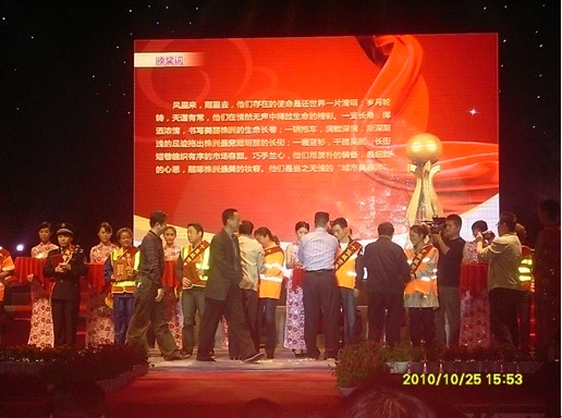10月25日下午,株洲市"小手拉大手"献给城市美容师心里话活动总结表彰大会在市委礼堂隆重召开。大会总结表彰了在"小手拉大手"活动中涌现的一批优秀的先进个人、组织团体,并向城市美容师敬献了鲜花。区环卫处一线环卫工人龙和平、贺兵秋被评为"十佳城市美容师",周丽娜被评为"优秀城市美容师"。