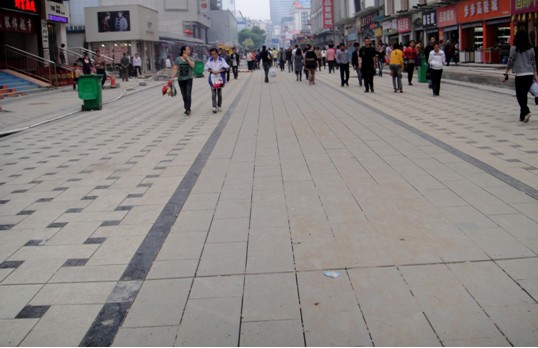 根据广东集美设计公司的设计理念,人民南路的麻石铺装既要体现服饰城"织物"纹理的图案需要,又要满足在实行步行化之前的行车荷载的需要。设计方案为车行道中间3米用600*300*120的佛岗青石板,两侧路面用600*300*120的天然花岗石板间黑金沙的形式铺成"正纹理",人行道采用300*300*40的花岗岩板斜铺间中国红花岗岩板铺成"斜纹理",整体风格既简洁大方,又精致而富有特色。