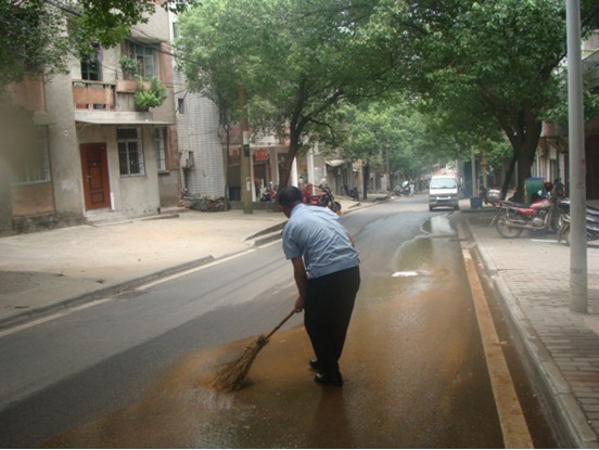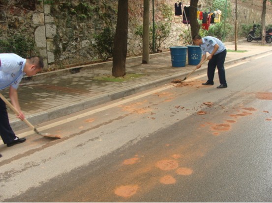 8月23日 ,区城管局建筑垃圾处置中队(以下简称渣土中队)在鑫盛路段发现路面污染,并及时清除。近来由于天气较好,各大小工地全面开工,我区渣土污染路面现象一度相当严重,为此渣土中队两班成员坚持24小时无缝巡查,顶高温、冒酷暑,昼夜不停的奔驰于芦淞区的大街小巷,重点加强对建筑工地车辆出入的管理控制,从源头治理,正本清源。遇突发污染即时处理,绝不让污染多停留路面一秒。竭尽全力确保我区路面干净整洁,城市环境和谐宜居。