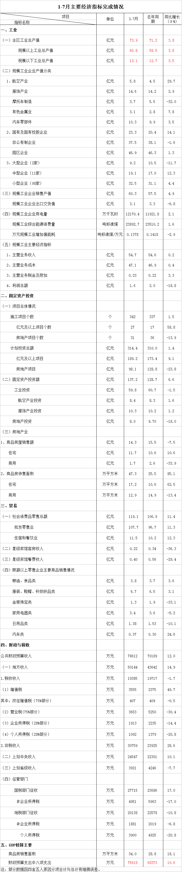 2016年1-7月主要经济指标完成情况