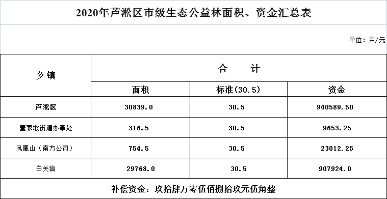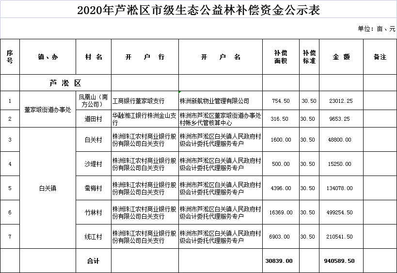 芦淞区2020年市级生态公益林面积、资金公示
