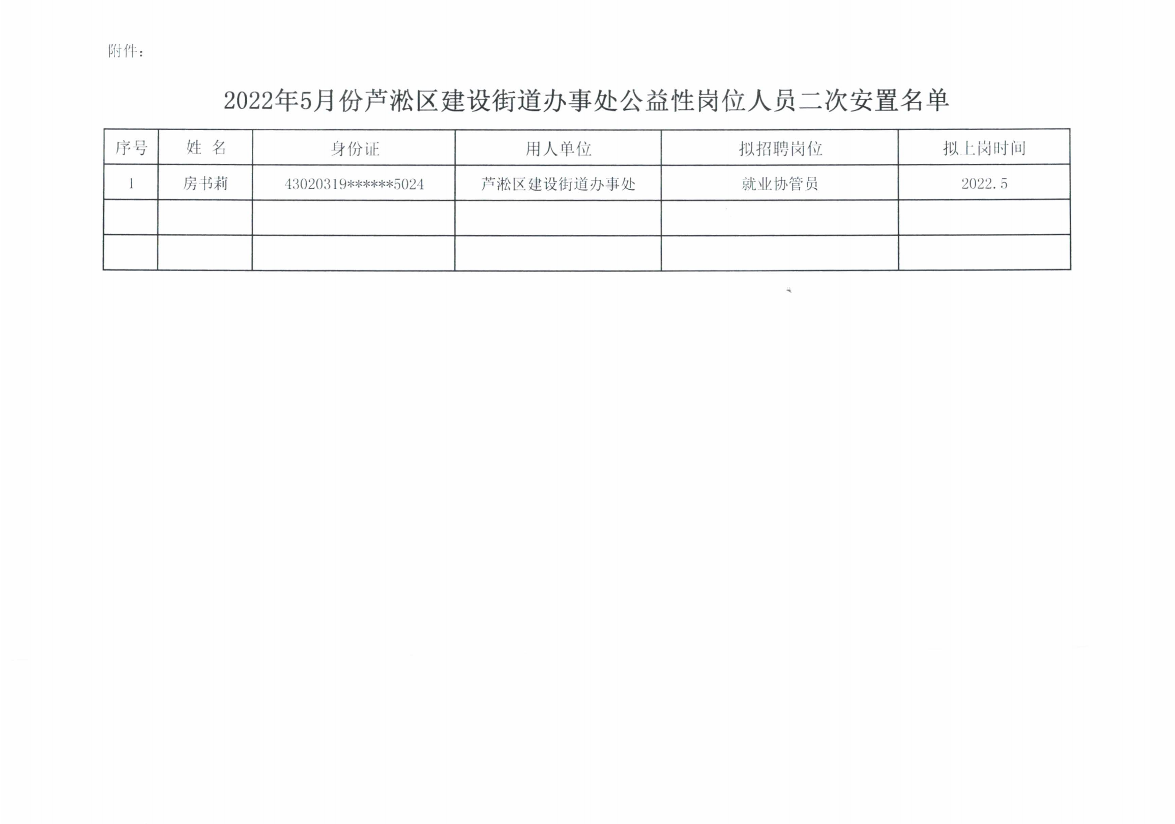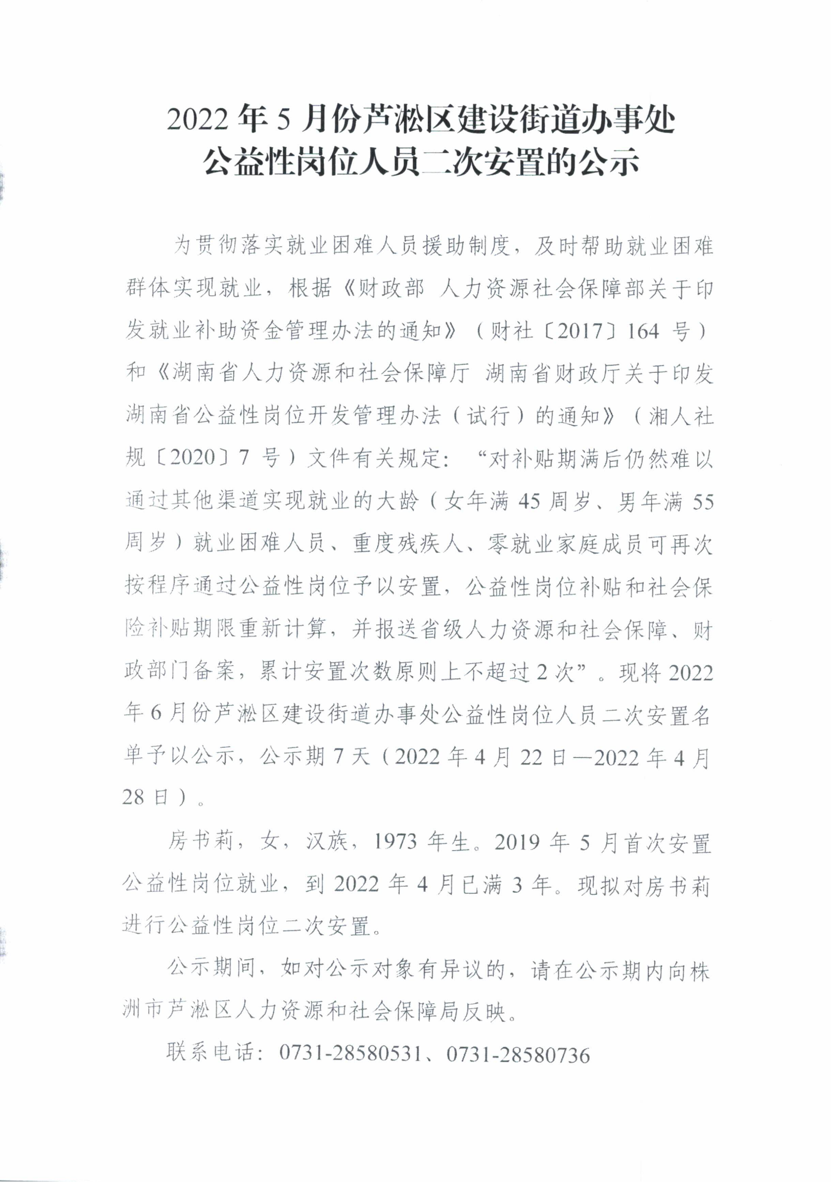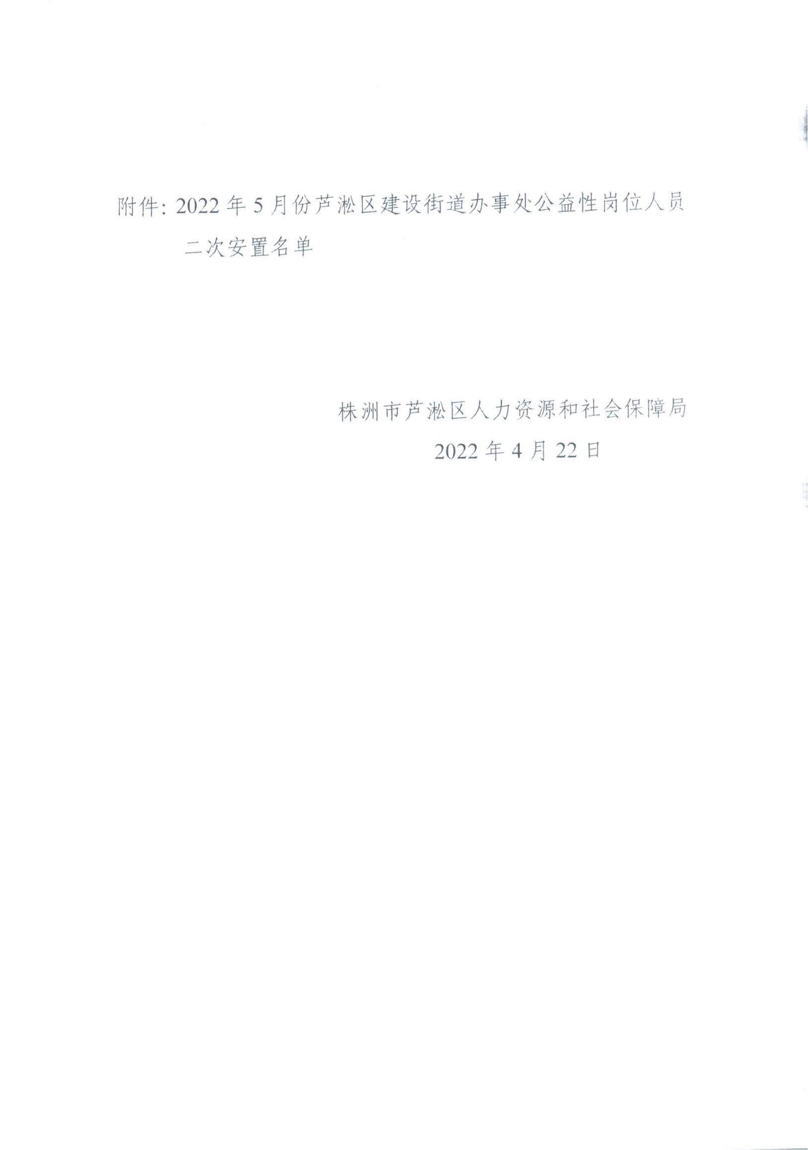 2022年5月份芦淞区建设街道办事处公益性岗位人员二次安置的公示
