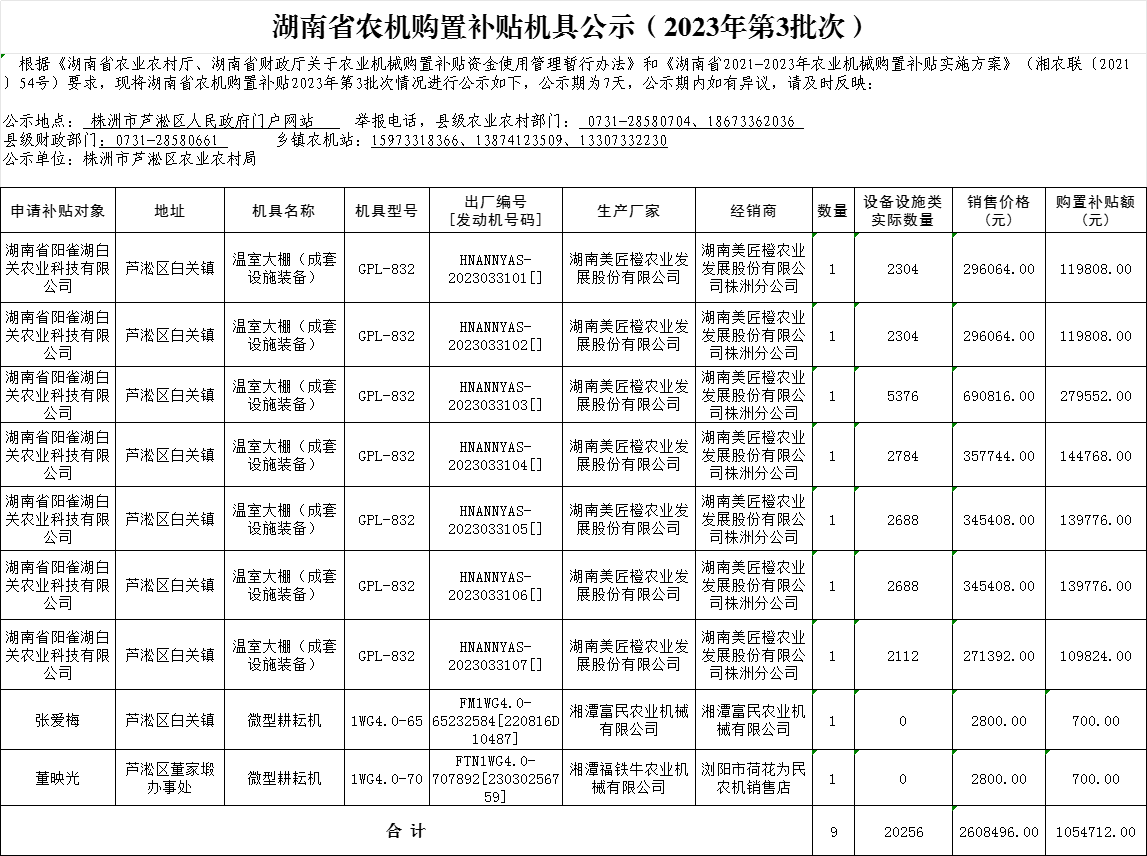区农业农村局关于湖南省农机购置补贴机具的公示(2023年第3批次)