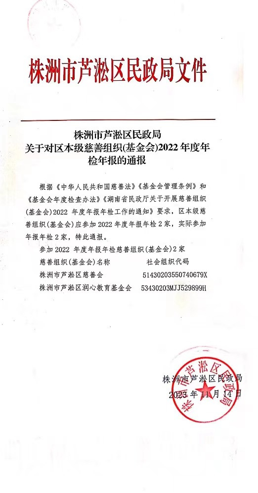 株洲市芦淞区民政局关于对区本级慈善组织(基金会)2022年度年检年报的通报
