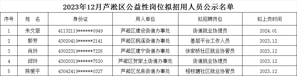 附件:2023年12月芦淞区公益性岗位拟招用人员公示名单