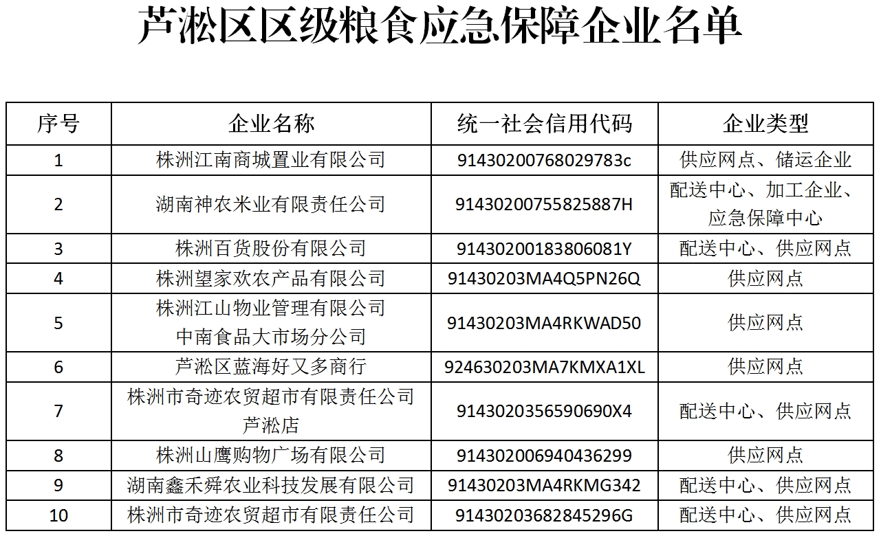 根据《粮食应急保障企业管理办法》(国粮仓规〔2021]193号)和《株洲市粮食应急预案》要求,经各单位推荐、区发改局审定,认定区级粮食应急供应网点9家、区级粮食应急加工企业1家、区级粮食应急配送中心5家、区级粮食应急储运企业1家、区级粮食应急保障中心1家,现予以公布。 各单位要加强对粮食应急保障企业的管理,各应急保障企业要认真履行职责,确保应急需要时有粮可用、有粮可调、有粮可供。