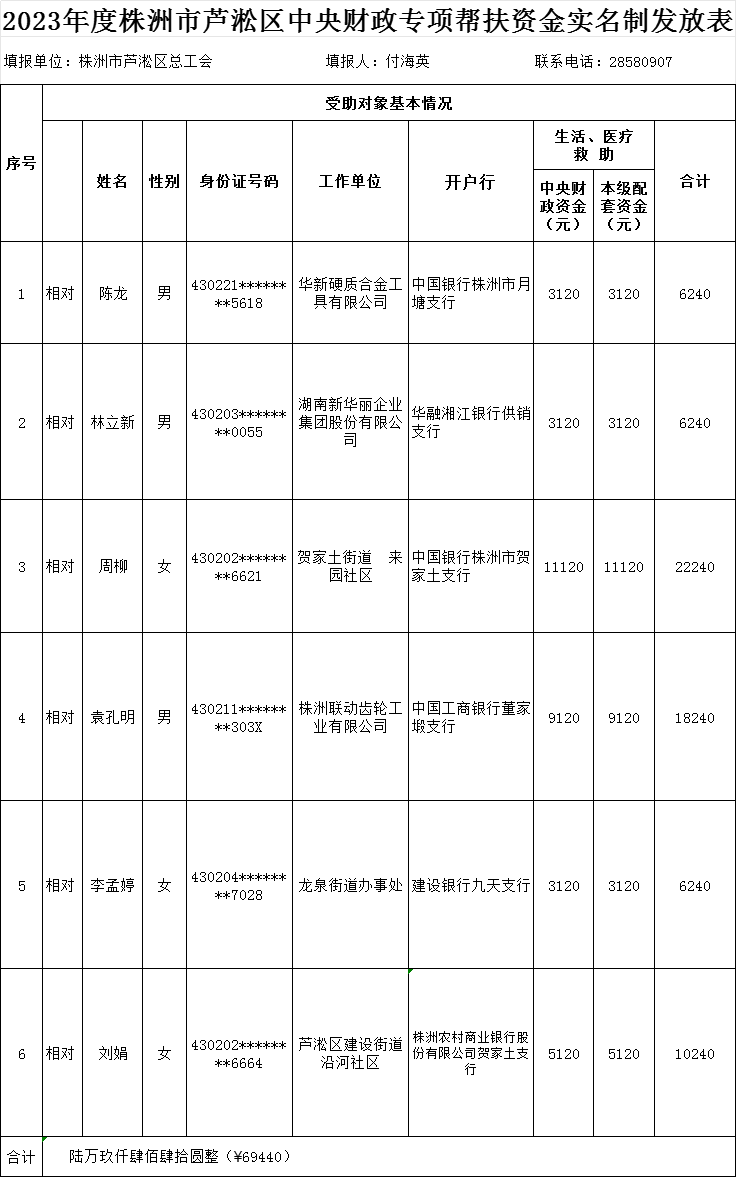 按照株洲市困难职工救助办法要求,经芦淞区总工会上门入户逐一调查核实,将对辖区内6名建档困难职工进行救助。为确保救助工作的公开、公平和公正,现将拟救助名单向社会公示,请社会各界监督。具体名单见附件。 联系电话:28580907