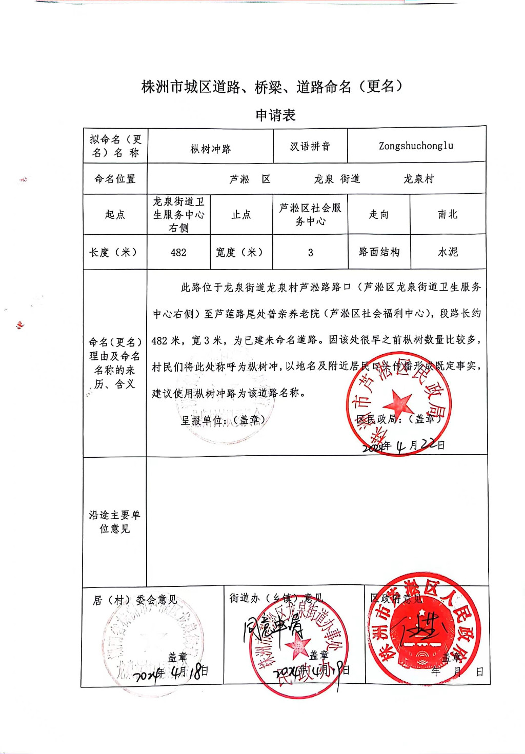 根据国务院《地名管理条例》规定,芦淞区《关于对龙泉街道龙泉村道路命名的请示》地名命名事项已于2024年4月22日经芦淞区政府批准并报我局备案,批准文号株芦政〔2024〕9号,现予以公告。
