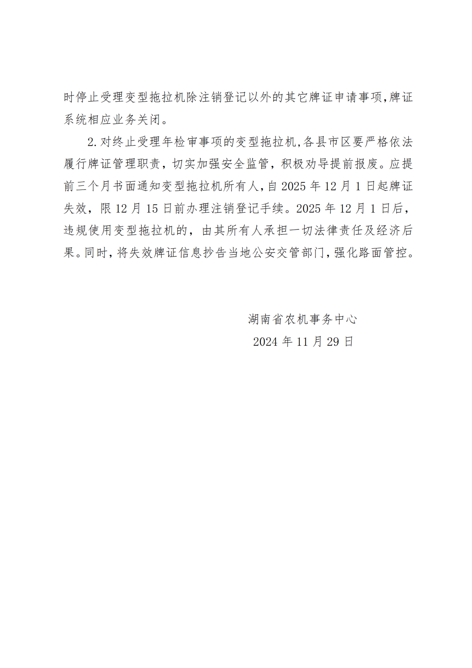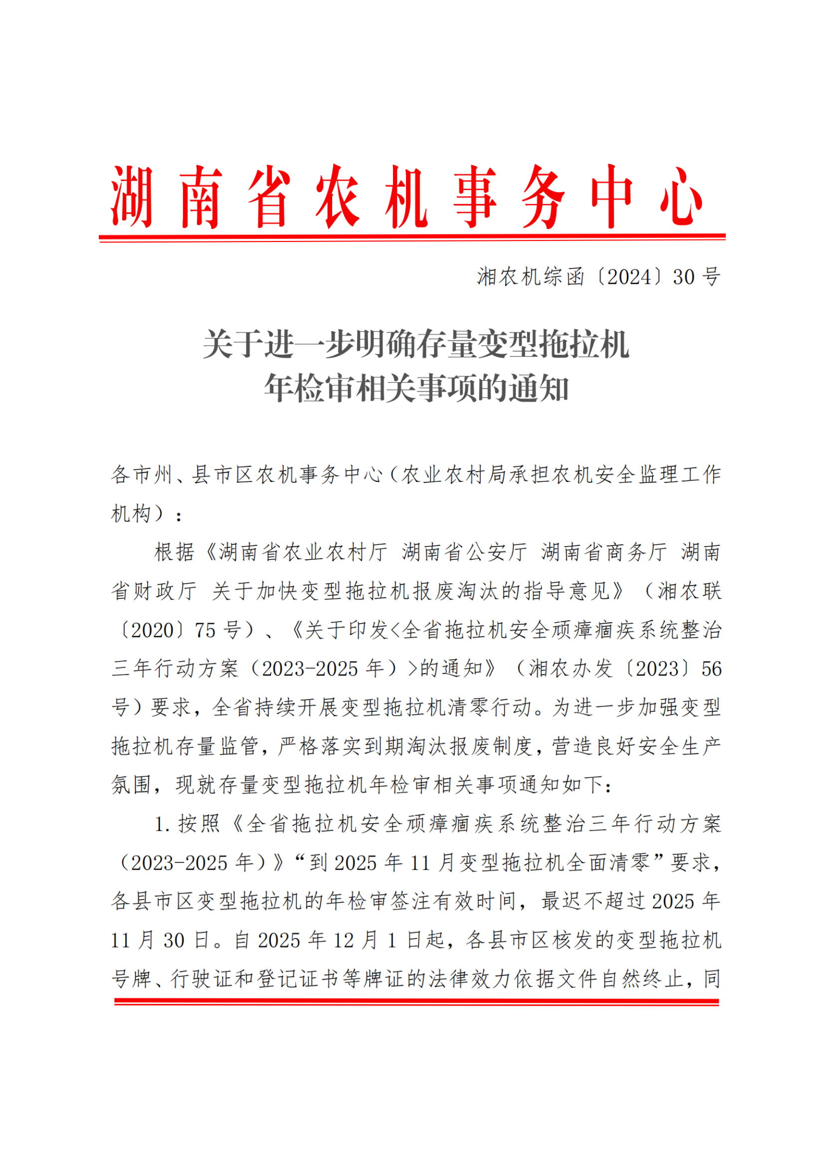 关于进一步明确存量变型拖拉机年检审相关事项的通知