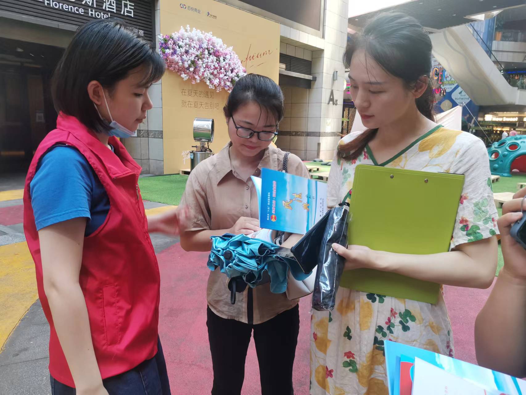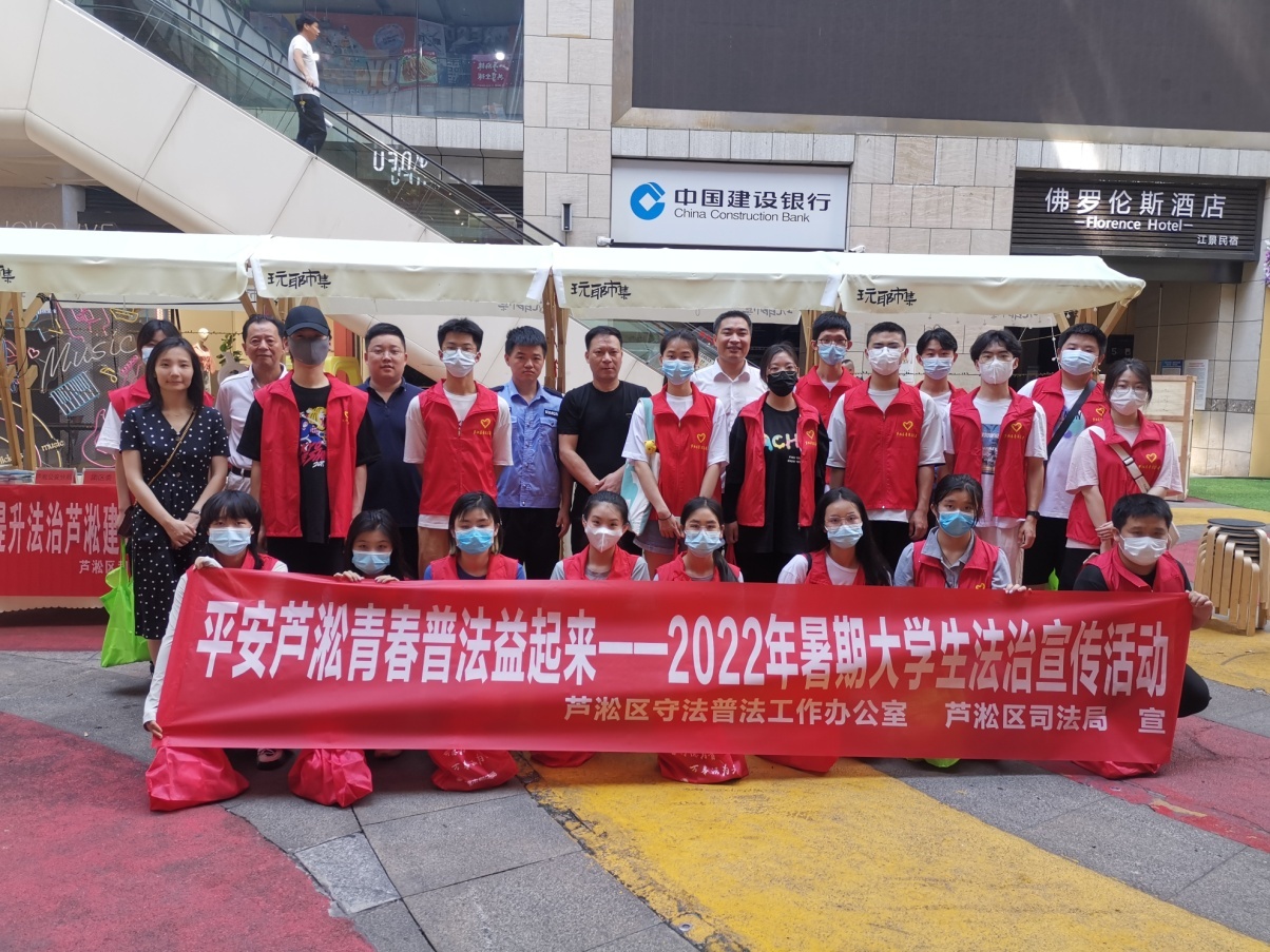 7月22日,芦淞区司法局联合团区委、芦淞公安分局、建设街道办事处在希尔顿广场开展"平安芦淞青春普法益起来"2022年暑期大学生法治宣传活动。近30名暑假返乡大学生志愿者参与活动,为法治芦淞建设贡献青春力量。