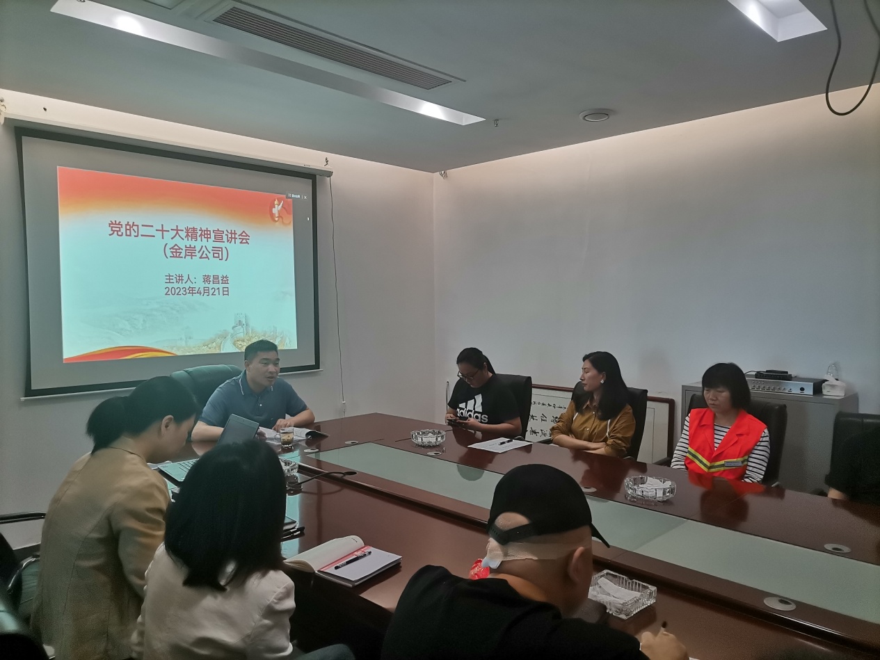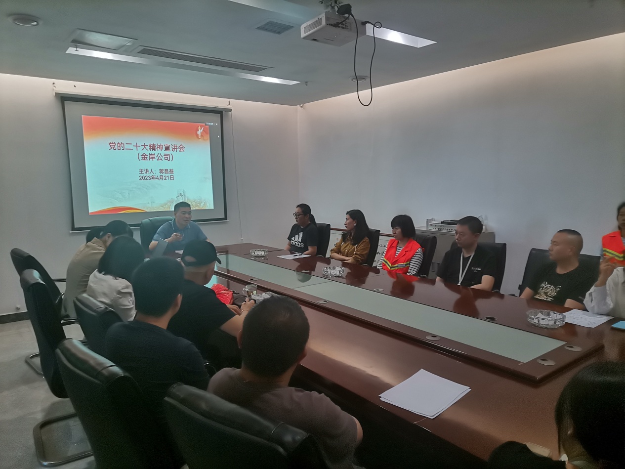 湖南金岸房地产开发有限公司是位于芦淞市场的房产企业,4月21日上午,公司开展了"齐心共学二十大,携手奋进向未来"学习活动。芦淞区委宣讲团成员、区司法局党组书记、局长蒋昌益同志到现场开展宣讲报告,对党的二十大精神进行了深入阐述和系统宣讲,分享了自己的学习体会、感悟和收获,并结合企业发展实际提了要求和希望,引起了职工们的广泛共鸣。