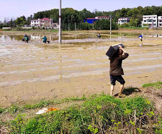 时值春耕农忙时期,芦淞区白关镇云山村,700余亩平整的田地里清水汪汪,一盘盘用来育秧的软盘已经被平铺上,村民们光着脚丫,弯着腰,裤管和袖子高高卷起,忙着撒种、盖土、覆膜。要不了多久,这里就会是绿油油一片。