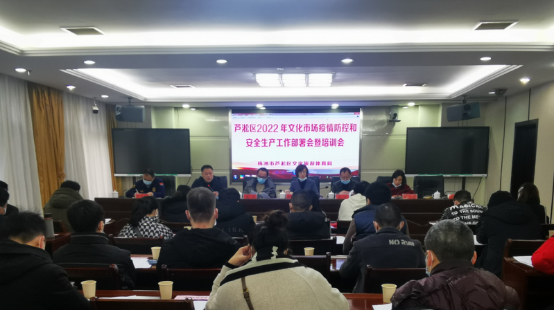 1月18日上午,芦淞区召开2022年文化市场疫情防控和安全生产工作部署会暨培训会,区政府党组成员、副区长郝陆游出席并讲话,市文化市场综合行政执法支队娱乐演出执法大队大队长王文、网吧执法大队大队长聂晶、区消防大队参谋罗文明参会并作专业指导,区文旅体局党组书记、局长谢玉莹主持会议,区文旅体局其他班子成员、街道分管负责人及芦淞区范围内KTV、网吧、电玩室经营业主参加会议。