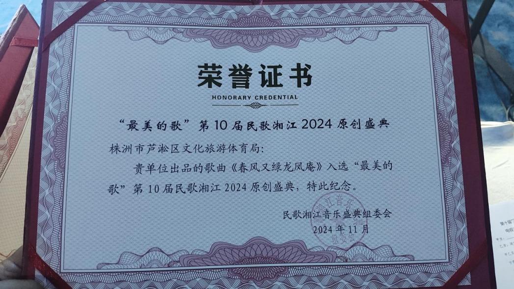 本次盛典汇聚了来自全国各地的30位声乐展演嘉宾,他们齐聚长沙,共同为这场音乐盛宴奉献了精彩的演出。由区文旅体局出品的歌曲《春风又绿龙凤庵》,成功入选"最美的歌"第十届【民歌湘江】2024原创盛典,并将于11月18日在湖南卫视国际频道播出。