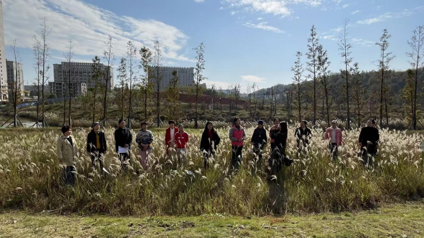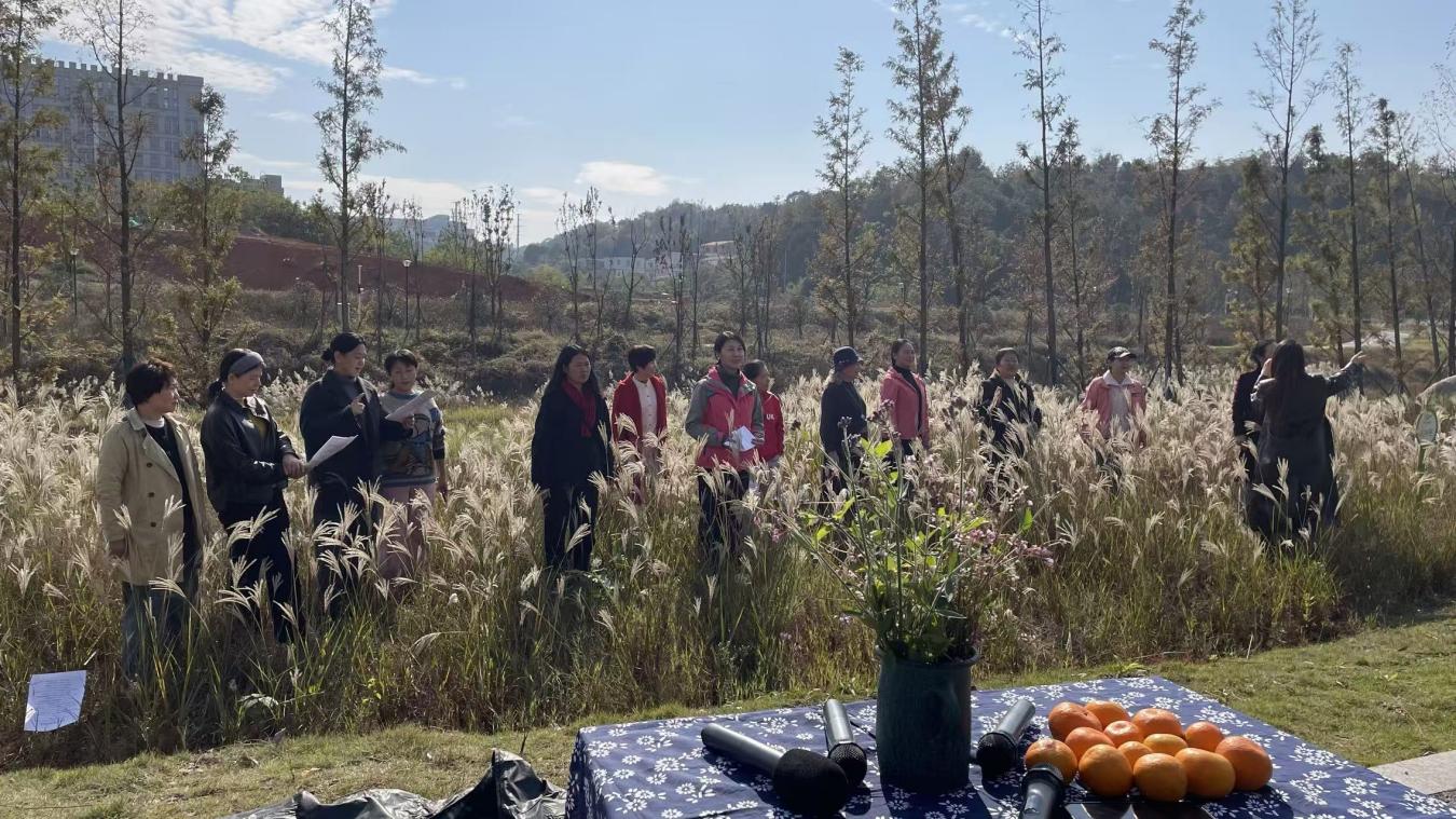 为创新教学形式,最后一次课程朗诵《秋天里的中国》特别移至户外开展。虽已入初冬,但斑叶芒等秋日植物仍展现着斑斓色彩,学员们在自然景致中以声绘景,沉浸式体验"诗中有画,画中有声"的艺术境界。参训学员表示:"从气息控制到情感传递,老师的教学细致入微,让我重新发现了朗诵的魅力。"