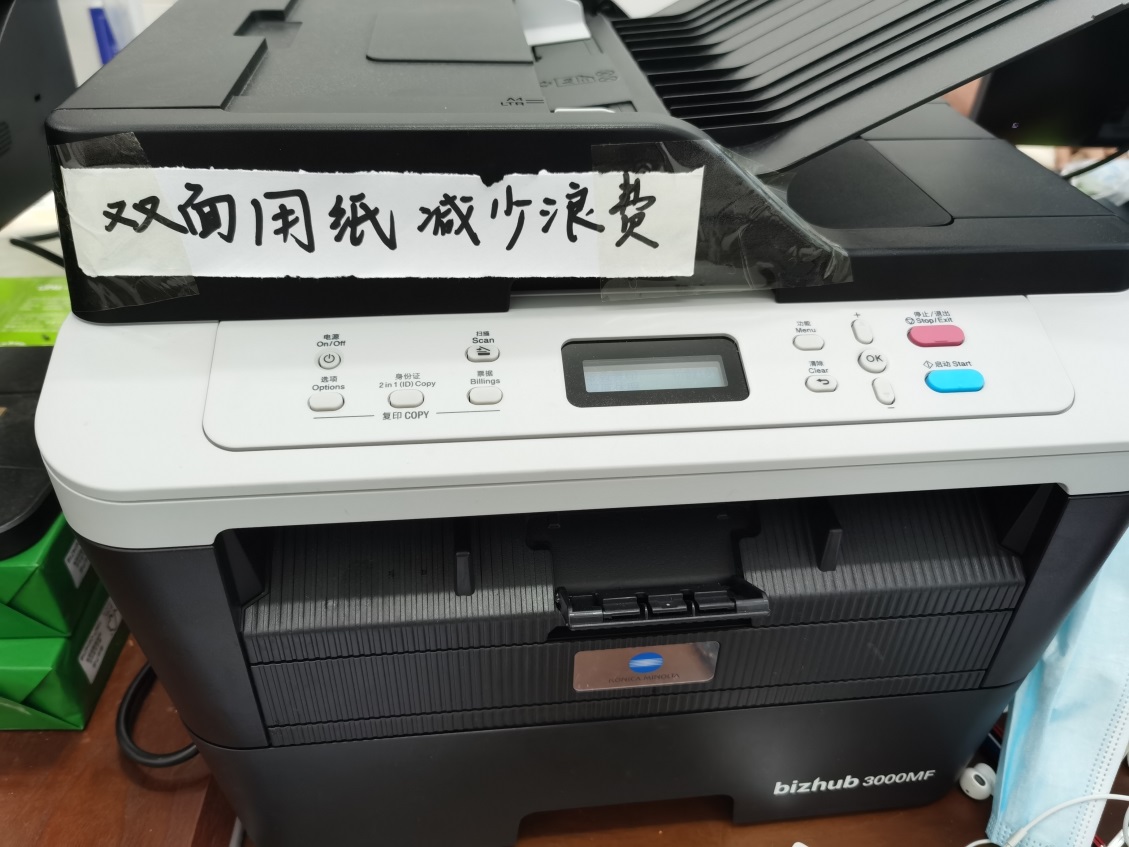 在办公打印机上张贴"节约用纸"醒目标语,提醒干部职工将合理利用资源、保护环境的意识根植于心,在工作中节约用纸,文件打印除特殊规定外,一律双面打印。