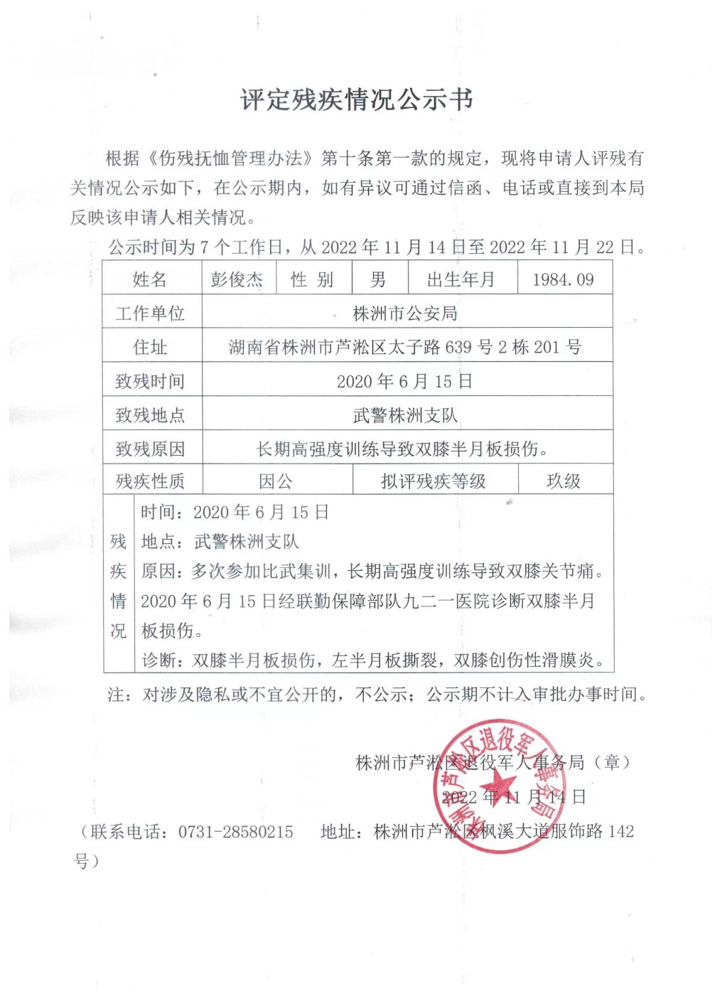 区退役军人事务局关于评定伤残情况的公示