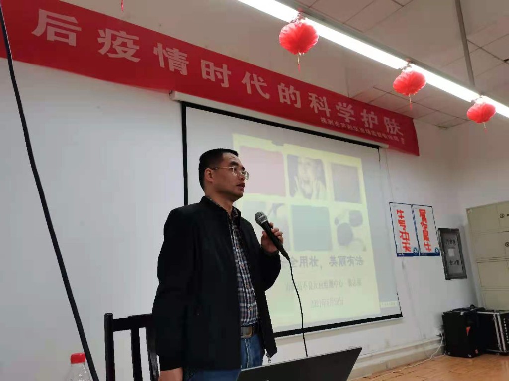科普大讲堂邀请了株洲市药品审评认证与不良反应监测中心主任黎志福开设讲座。黎主任通过多个化妆品的案例生动直白地讲述了化妆品不良反应的概念,分析了产生的原因,围绕芦淞区实际情况、存在的问题等方面,耐心细致地向大家讲解了相关法律规定,提出解决问题的建议。
