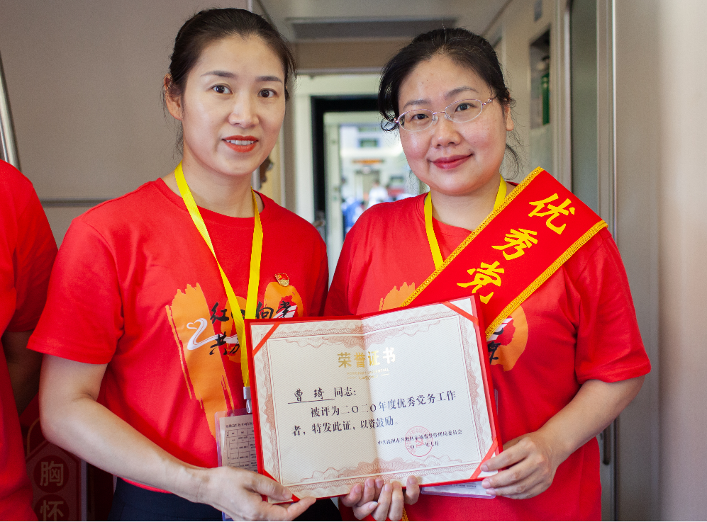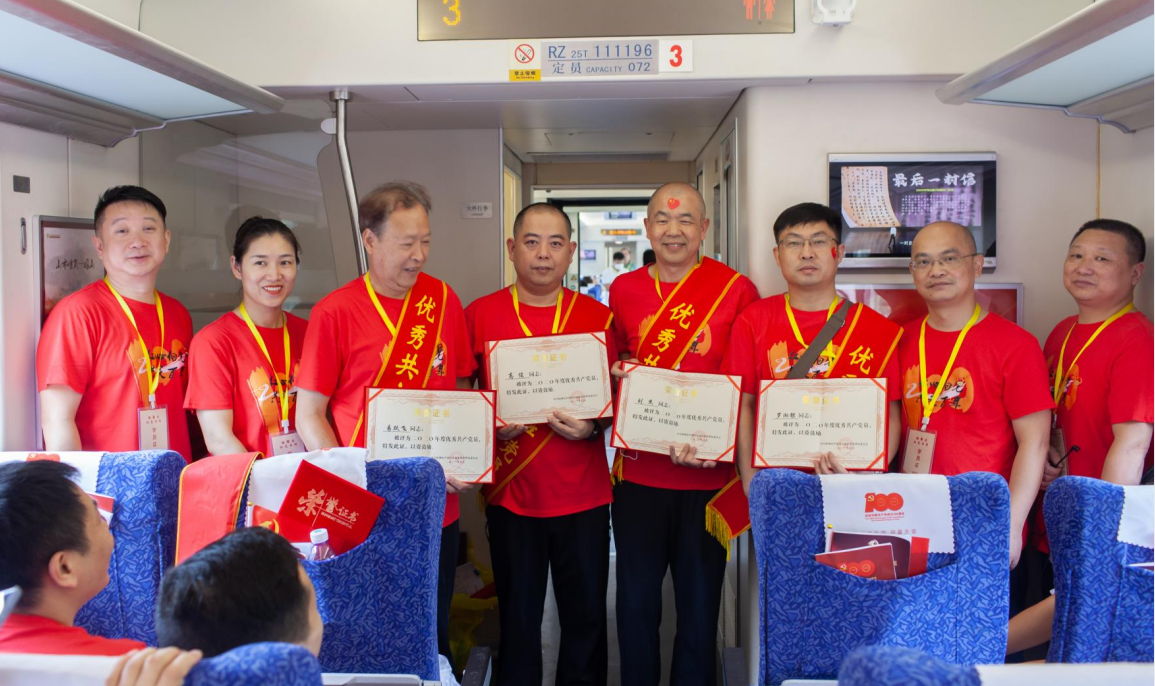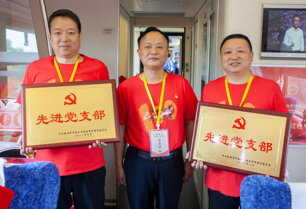 红色专列上,区市场监管局党委书记、局长夏志毅带领全体党员干部高举右拳,重温一遍入党誓词。区局党委宣布《关于表彰优秀共产党员、优秀党务工作者和先进基层党组织的决定》,现场颁发荣誉证书和奖牌。