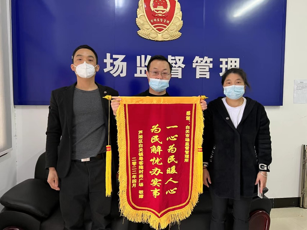 4月15日上午,芦淞区白关镇粤客隆时尚广场负责人吴小毛为芦淞区市场监督管理局白关所送来一面写着“一心为民暖人心,为民解忧办实事”的锦旗,对白关监管所表达诚挚的谢意。