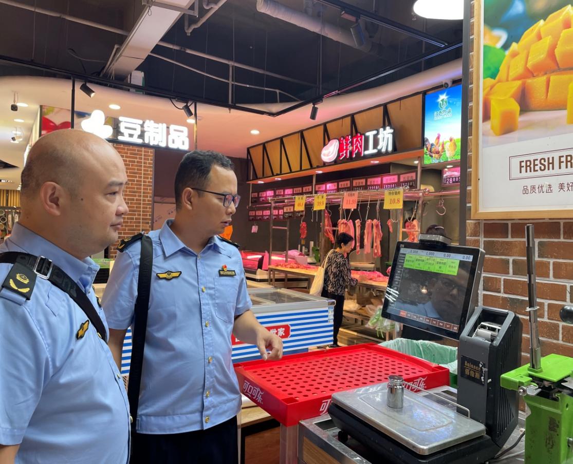 执法人员先后来到贺家土蓝海农贸市场、好又多生鲜超市、戴永红量贩零食、零食很忙量贩店等地,以生鲜、肉类、水果店等人流量大、电子计价秤使用频率高的店铺为检查重点,利用标准砝码对经营户电子计价秤进行校准,查看是否存在缺斤少两、人为作弊、破坏计量器具准确度等违法违规行为。