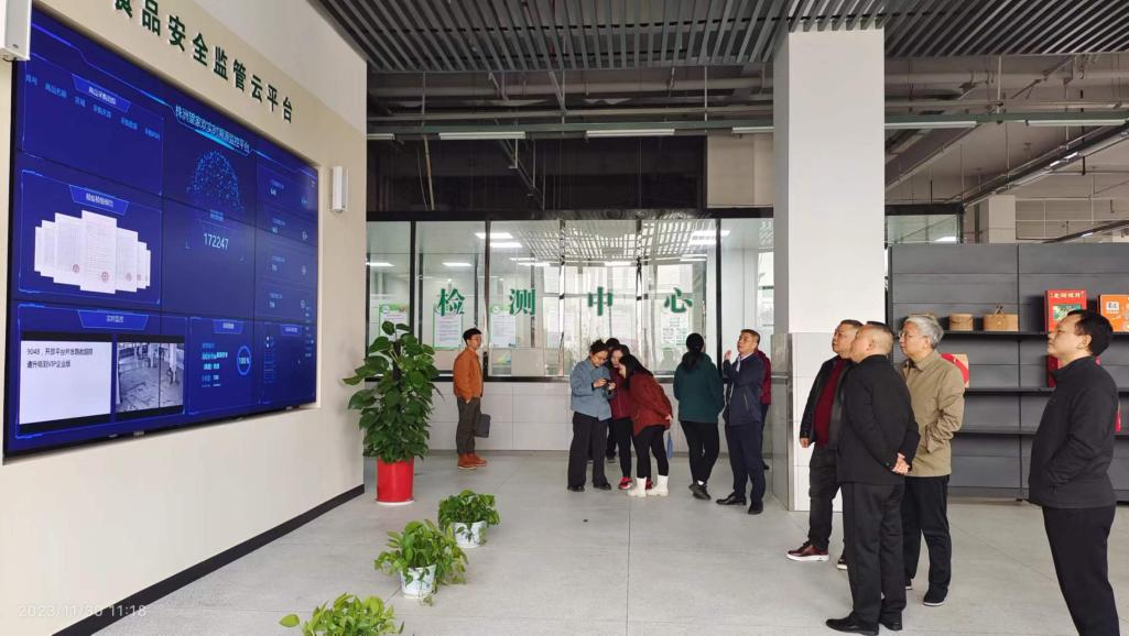 在株洲望家欢农产品有限公司,视察组现场查看了食品配送中心、冷冻库、保鲜库、农副产品检测室、副食品干货仓库环境卫生及产品储存条件,并对公司食品原材料采购及检验、食品加工制作及留样、"互联网+明厨亮灶"等情况做了详细调研。